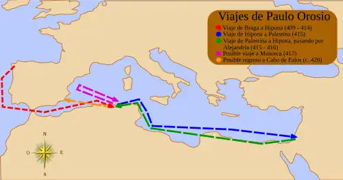 Mapa esquemático com todas as viagens de Paulo Orósio.[17]