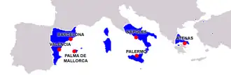 Mapa anacrónico de todas as possessões da Coroa de Aragão ao longo da sua história