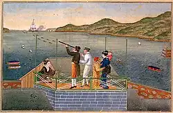 Entrada de um navio holandês Xilogravura a cores por Kawahara Keiga: Philipp Franz von Siebold na baía de Nagasaki em Dejima com telescópio,a sua parceira Sonogi O-Taki com a filha Kusumoto Ine nas costas.