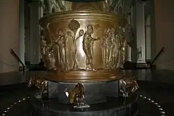 As figuras na pia estão em alto-relevo, e tem um notável classicismo de estilo; tanto que sugeriu-se que tenha sido, de fato, feita em Constantinopla,[8] ou por gregos em Roma ca. 1000. Outras explicações atribuem o classicismo à influência bizantina,[13] porém como Honour e Fleming sugerem, "em proporções corporais, poses, gestos e roupas, eles lembras modelos clássicos muito além das artes bizantina, carolíngia, ou mesmo cristã precoce"; eles sugerem que o artista pode ter visto esculturas gregas antigas em Constantinopla quando da Primeira Cruzada.[14] Outros autores explicam o estilo como emergindo das antigas tradições mosana e carolíngia, com influência bizantina recente, e prefigurando o estilo figurativo gótico.[15][16]