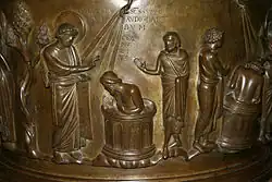 - ↑ São Pedro batizando uma figura indeterminada é mostrado em uma capa de marfim de um livro de 900 em Florença, em uma composição similiar que também possui um leigo a direita segurando têxteis (roupas de catecumenato nuas, ou uma toalha) com véu em suas mãos de uma forma similar ao anjo no Batismo de Jesus na pia.[33]