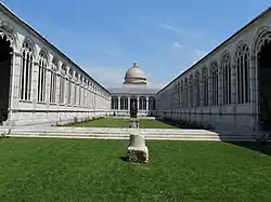 A Praça dos Milagres da cidade de Pisa, tendo começado por se localizar fora das muralhas, com a expansão da povoação no século XIII até ao século XX manteve-se na zona menos construída da cidade, o canto Noroeste, como se pode verificar pelas cartas da cidade que ainda em 1626 representam a região povoada por quintas, e muito vazia em 1750.