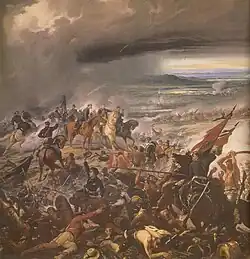 O estilo romântico e neoclássico tiveram influência na pintura histórica. A preocupação com a execução das figuras, se atendo aos detalhes, nos trajes, nos animais, na fisionomia das personagens. As cores carregam expressividade e as paisagens recebem bastante atenção, sempre com um tom grandioso e ímpeto de ação, enobrecendo a guerra ao invés de assinalar sua crueldade.