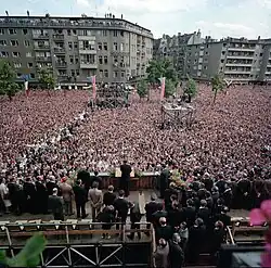 Em 4 de junho de 1961, o presidente se encontrou com Khrushchev, onde deixou claro que qualquer tratado entre Berlim Oriental e a União Soviética que interferisse nos direitos de acesso dos EUA em Berlim Ocidental seria considerado um ato de guerra.[39] Os dois líderes também discutiram a situação no Laos, a crise do Congo, o incipiente programa nuclear da China, um possível tratado de proibição de testes nucleares e outras questões.[40] Pouco depois de Kennedy voltar para casa, a União Soviética anunciou sua intenção de assinar um tratado com Berlim Oriental que ameaçaria o acesso ocidental a Berlim Ocidental. Kennedy, deprimido e irritado, assumiu que sua única opção era preparar o país para uma guerra nuclear, que ele pessoalmente achava que tinha uma chance em cinco de ocorrer.[39]