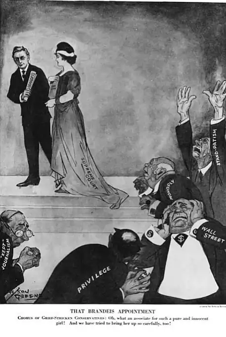 Wilson nomeou três homens para a Suprema Corte dos Estados Unidos. Ele nomeou James Clark McReynolds em 1914; ele era um ultraconservador que serviu até 1941. Wilson queria nomear Louis Brandeis para seu Gabinete em 1913, mas ele era muito controverso na época e, em vez disso, serviu privadamente como principal conselheiro jurídico de Wilson. Em 1916, Wilson nomeou Brandeis para a Suprema Corte, dando início a um grande debate sobre a ideologia progressista de Brandeis e sua religião; Brandeis foi o primeiro judeu nomeado para a Suprema Corte e o antissemitismo era galopante nos círculos da classe alta. Mas Brandeis tinha muitos amigos que admiravam sua perspicácia jurídica na luta por causas progressistas. Eles organizaram uma campanha publicitária nacional que marginalizou as calúnias antissemitas na profissão jurídica. [26] Wilson trabalhou duro e convenceu os democratas do Senado a votarem em Brandeis, que atuou como um grande liberal até 1939. Em 1916, Wilson nomeou John Hessin Clarke, um advogado progressista que renunciou em 1922 após disputas acirradas com McReynolds. [27] [28]