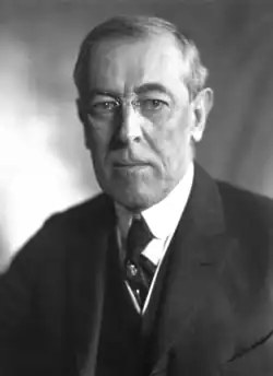 O segundo mandato de Wilson foi dominado pelo papel dos Estados Unidos na luta e no financiamento da Guerra Mundial e na criação de um mundo pacífico no pós-guerra. Em abril de 1917, quando a Alemanha retomou a guerra submarina irrestrita, Wilson pediu ao Congresso que declarasse guerra para tornar "o mundo seguro para a democracia". Por meio da Lei de Serviço Seletivo, o recrutamento enviou 10.000 soldados recém-treinados para a França por dia no verão de 1918. No plano interno, Wilson aumentou os impostos de renda, criou o Conselho das Indústrias de Guerra, promoveu a cooperação sindical, regulamentou a agricultura e a produção de alimentos por meio da Lei Lever e nacionalizou o sistema ferroviário do país. Em seu Estado da União de 1915, Wilson solicitou ao Congresso o que viria a ser a Lei de Espionagem de 1917 e a Lei de Sedição de 1918, reprimindo ativistas contrários ao recrutamento. A repressão foi posteriormente intensificada pelo procurador-geral A. Mitchell Palmer para incluir a expulsão de radicais não cidadãos durante o Primeiro Pânico Vermelho de 1919-1920. Wilson infundiu moralidade no seu internacionalismo, uma ideologia agora referida como "Wilsonianismo" — uma política externa ativista que apela à nação para promover a democracia global. [1] [2] No início de 1918, ele emitiu seus princípios para a paz, os Quatorze Pontos, e em 1919, após a assinatura de um armistício com a Alemanha, ele viajou para Paris, concluindo o Tratado de Versalhes. Wilson embarcou em uma turnê nacional para fazer campanha pelo tratado, que incluiria a entrada dos EUA na Liga das Nações. Ele ficou incapacitado por um derrame em outubro de 1919 e o tratado fracassou no Senado.