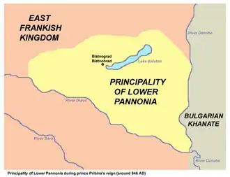 Pribina foi atacado e removido de sua terra por Moimir I (r. década de 820/830–846), duque da Morávia. Ele primeiro fugiu a Ratbodo, uma dos senhores fronteiriços da Frância Oriental, e vagou na Europa Central e Sudeste por vários anos. Por fim, no final da década de 830, Luís, o Germânico (r. 817–876), rei da Frância Oriental, conferiu a Pribina territórios próximo ao lago Balatão (hoje na Hungria), onde estabeleceu seu próprio principado sob a suserania do rei.[4][5] Ele morreu lutando contra os morávios.[6]