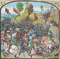 ![]() Batalha de Nájera, num manuscrito do século XV; os Ingleses e Pedro estão à direita | |||