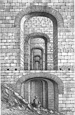 Vista interior das câmaras abobadadas da Prisão de Anemas, de uma ilustração do século XIX