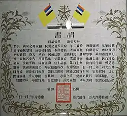 A Imperatriz Viúva Longyu endossou o "Édito Imperial de Abdicação do Imperador Qing" (清帝退位詔書) em 12 de fevereiro de 1912 sob um acordo negociado por Yuan, agora primeiro-ministro, com a corte imperial em Pequim e os republicanos no sul da China.[32] Puyi relembrou em sua autobiografia o encontro entre Longyu e Yuan: