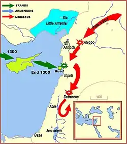 A queda do Principado de Antioquia começou logo após o fim da primeira das Cruzadas de Luís IX, quando, em 1254, Boemundo VI de Antioquia se casou com Sibila da Armênia. Isso encerrou uma luta épica pelo poder, com a Armênia sendo a mais poderosa e Antioquia um estado vassalo. Ambos foram varridos pelo conflito entre os mamelucos e os mongóis. Em 1260, sob a influência de seu sogro Hetum I da Armênia, Boemundo VI se submeteu ao governante mongol Hulagu, tornando Antioquia um estado tributário dos mongóis. Boemundo e Hetum lutaram ao lado dos mongóis durante as conquistas da Síria, tomando primeiro Alepo e depois Damasco. [44]