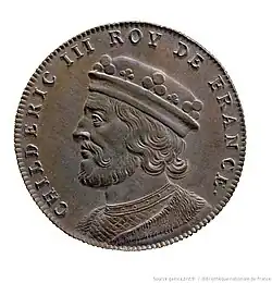 ![]() Representação fictícia de Quilderico III, medalhão do século XVIII de Jean Dassier | |
