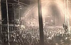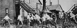 Durante esse período, tensões raciais aumentaram, culminando em violência em várias cidades, especialmente em Chicago. Os linchamentos, frequentemente motivados por racismo, aumentaram drasticamente nas décadas de 1910 e 1920. Os tumultos urbanos, com brancos atacando negros, tornaram-se mais frequentes, principalmente no Norte e no Oeste.[74] Muitos brancos responderam com violência, intimidação ou táticas legais contra os afro-americanos, enquanto outros migraram para áreas suburbanas ou exurbanas, em um processo conhecido como “fuga dos brancos”.[75] A segregação residencial foi formalizada por meio de convenções raciais restritivas, que foram consideradas inconstitucionais pela Suprema Corte no caso Shelley v. Kraemer, em 1948, com base na Décima Quarta Emenda.[76]