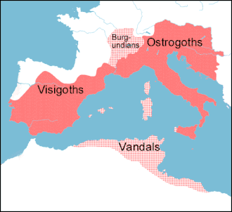 Máxima extensão do território governado por Teodorico (vermelho escuro). As zonas pontilhadas expressam os Estados que estavam em sua órbita de influência através de alianças matrimoniais