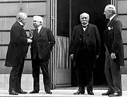 Em 1914, na véspera da Primeira Guerra Mundial, havia dois grandes blocos na Europa: a Tríplice Entente formada pela França, Grã-Bretanha e Rússia e a Tríplice Aliança formada pela Alemanha, Áustria-Hungria e Itália. A Itália permaneceu neutra e se juntou à Entente em 1915, enquanto o Império Otomano e a Bulgária se juntaram às Potências Centrais. A neutralidade era a política da Bélgica, Países Baixos, Luxemburgo, Dinamarca, Suécia, Noruega, Grécia, Portugal, Espanha e Suíça. [nota 1] A Primeira Guerra Mundial inesperadamente levou as capacidades militares, diplomáticas, sociais e econômicas das grandes potências aos seus limites. Alemanha, Áustria-Hungria, Império Otomano e Bulgária foram derrotados; a Alemanha perdeu seu status de grande potência, a Bulgária perdeu mais território e os outros foram divididos em coleções de estados. Os vencedores Grã-Bretanha, França, Itália e Japão ganharam assentos permanentes no conselho de governo da nova Liga das Nações. Os Estados Unidos, que deveriam ser o quinto membro permanente, decidiram operar de forma independente e nunca se juntaram à Liga.