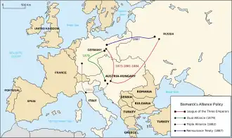 O principal erro de Bismarck foi ceder ao Exército e à intensa demanda pública na Alemanha pela aquisição das províncias fronteiriças da Alsácia-Lorena, transformando assim a França em um inimigo permanente e profundamente comprometido (veja inimizade franco-alemã). Theodore Zeldin diz: "A vingança e a recuperação da Alsácia-Lorena se tornaram o principal objetivo da política francesa pelos próximos quarenta anos. Que a Alemanha era inimiga da França se tornou o fato básico das relações internacionais."[134] A solução de Bismarck foi fazer da França uma nação pária, encorajando a realeza a ridicularizar seu novo status republicano e construindo alianças complexas com as outras grandes potências - Áustria, Rússia e Grã-Bretanha - para manter a França isolada diplomaticamente.[135][136] Um elemento-chave foi a Liga dos Três Imperadores, na qual Bismarck reuniu governantes em Berlim, Viena e São Petersburgo para garantir a segurança uns dos outros, enquanto bloqueavam a França; durou de 1881 a 1887.[137][138]
