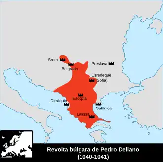 Em 1040, Pedro Deliano, que alegava ser um descendente de Samuel da Bulgária, escapou de Constantinopla e começou a vagar por toda a Bulgária, eventualmente alcançando Morava e, finalmente, Belgrado. A revolta irrompeu ali, onde Deliano foi proclamado "imperador da Bulgária"[2], assumindo o nome de "Pedro II", uma homenagem a Pedro I. Os búlgaros avançaram para o sul em direção aos últimos centros políticos do império, Ácrida e Escópia. No caminho, a população local se juntou a eles, aceitando Pedro Deliano como seu imperador e assassinando todos os bizantinos que encontravam[3]. Ao mesmo tempo, os búlgaros do Tema de Dirráquio se uniram sob a liderança do soldado Ticomiro[4] e avançaram para oeste, alcançando as antigas capitais. A existência de dois campos rebeldes distintos[5] se tornou uma ameaça real para o sucesso da revolta. Pedro Deliano escreveu uma carta para Ticomiro para negociar a execução de ações conjuntas e fez um discurso no qual, em linguagem figurada, contou ao povo que não seria possível ter dois papagaios num mesmo arbusto sem discórdia e que dois imperadores não poderiam dividir um mesmo país[6]. Por isso, eles deveriam escolher apenas um líder, ele ou Ticomiro. Pedro deliberadamente utilizou-se da palavra "papagaios" por que dois papagaios formavam o antigo brasão da casa Cometópulos. Como ele tinha mais influência que seu rival, Deliano foi escolhido de forma unânime como líder e Ticomiro foi assassinado[7].