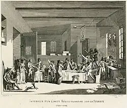 Entre os revolucionários de 1789, houve divisão. A grande burguesia não queria aprofundar a revolução, temendo o radicalismo popular. Aliada aos setores da nobreza liberal e do baixo clero, formou o Clube dos Girondinos. O nome "girondino" (do francês girondin) deve-se ao fato de Brissot, principal líder dessa fação, representar o departamento da Gironda e de seus principais líderes serem provenientes de lá. Eles ocupavam os bancos inferiores no salão das sessões. Os jacobinos (do francês jacobin) — assim chamados porque se reuniam no convento de Saint Jacques — queriam aprofundar a revolução, aumentando os direitos do povo; eram liderados pela pequena burguesia e apoiados pelos sans-culottes, as massas populares de Paris. Ocupavam os assentos superiores no salão das sessões, recebendo o nome de montanha. Seus principais líderes foram Danton, Marat e Robespierre. Sua facção mais radical era representada pelos raivosos, liderados por Jacques Hébert, que queriam o povo no poder. Havia ainda um grupo de deputados sem opiniões muito firmes, que votavam na proposta que tinha mais chances de vencer. Eram chamados de planície ou pântano. Havia ainda os cordeliers (camadas mais baixas) e os feuillants (a burguesia financeira).[42] Além deles, ainda havia uma outra facção, conhecida pelo nome de enragés e liderada por Jacques Roux, sendo considerada a ala mais radical da Revolução.[43] Em 1793, os enragés lançaram um forte manifesto criticando os ideais revolucionários burgueses de liberdade e igualdade e a própria noção de república, pois estes conceitos seriam meros fantasmas enquanto uma classe abastada continuasse ainda com o poder de deixar os pobres morrerem de fome.[44]
