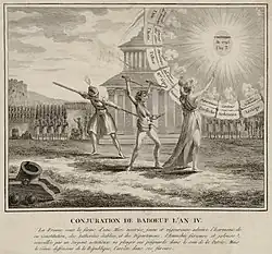 Os seguidores desse movimento popular, com algumas pinceladas socialistas, desejavam não apenas igualdades de direitos (igualdade perante a lei), mas também igualdade nas condições de vida. Babeuf achava que a única maneira de alcançar a igualdade era com a abolição da propriedade privada. A insurreição foi denunciada antes mesmo de se iniciar e seus líderes, Graco Babeuf e Buonarroti, foram condenados à guilhotina. As ideias de Babeuf, entretanto, serviram de base para a luta da classe operária no século XIX. Externamente, entretanto, o exército acumulava vitórias contra as forças absolutistas de Espanha, Holanda, Prússia e reinos da Itália, que, em 1799, formaram a Segunda Coligação contra a França revolucionária.[49]