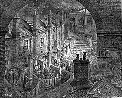 Uma grande literatura de exposição cresceu condenando as condições insalubres. De longe, a publicação mais famosa foi de um dos fundadores do movimento socialista, A Situação da Classe Trabalhadora na Inglaterra, em 1844, Friedrich Engels descreveu as ruas secundárias de Manchester e outras cidades industriais, onde as pessoas viviam em barracos rústicos, alguns não completamente fechadox, alguns com chão de terra batida. Essas favelas tinham passagens estreitas entre lotes e moradias de formato irregular. Não havia instalações sanitárias. A densidade populacional era extremamente alta.[74]