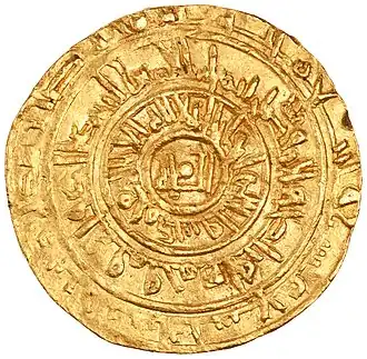 ![]() Dinar de ouro cunhado em Alepo em nome de Sale ibne Mirdas, reconhecendo a suserania do califa fatímida Ali Azair, 1028/29 | |||||