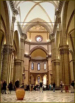 Os vitrais são os maiores em seu género na Itália entre os séculos XIV e XV, com imagens de santos do Velho e Novo Testamento. O crucifixo é obra de Benedetto da Maiano, a talha do coro de Bartolommeo Bandinelli, e as portas da sacristia são de Luca della Robbia.