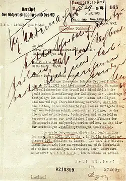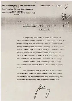 Em 31 de Julho de 1941, sob instruções de Adolf Hitler, Hermann Göring enviou uma carta a Reinhard Heydrich determinando que este lhe submetesse, assim que possível, um plano geral, incluindo uma previsão de meios materiais e organizacionais necessários para implementar uma "solução final para a questão judaica".[5]