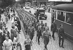 Depois disso, a SA foi ofuscada pela SS; em 1939, ela tinha pouca importância no Partido Nazista, embora nunca tenha sido formalmente dissolvida e tenha continuado a existir até o fim da guerra. Em janeiro de 1939, o papel da SA foi oficialmente estabelecido como uma escola de treinamento para as forças armadas, com o estabelecimento da SA Wehrmannschaften (Unidades Militares da SA). [39] Com o início da Segunda Guerra Mundial em setembro de 1939, a SA perdeu a maioria dos seus membros restantes para o serviço militar na Wehrmacht (forças armadas). [40]