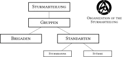 A SA foi organizada em vários grandes Gruppen regionais ("Grupos"). O líder do grupo respondia apenas à Stabschef-SA ou Hitler. [55] Cada Gruppe era composto por Brigaden subordinados ("Brigadas"). [56] Subordinado ao Brigaden eram os menores, do tamanho de um regimento, Standarten. [56] SA-Standarten operavam em todas as principais cidades alemãs e eram divididas em unidades ainda menores, conhecidas como Sturmbanne e Stürme.