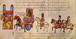 O imperador foi inicialmente identificado, pelo bizantinista francês André Grabar, com Basílio II (r. 976–1025), e seu retorno triunfal de suas guerras contra os búlgaros.[7] A pesquisa moderna, contudo, concluiu que o tecido represente João I Tzimisces (r. 969–976) e seu retorno em 971 de sua campanha contra os Rus' que tinham invadido e ocupado a Bulgária.[3][4]