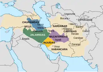 ![]() Alguns dos Estados sucessores do Ilcanato. O Sultanato Jalaírida aparece em verde | ||||||||||
