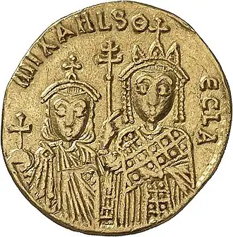![]() Tecla (direita) junto com seu irmão Miguel III no reverso de um soldo cunhado durante o reinado de sua mãe, Teodora | |