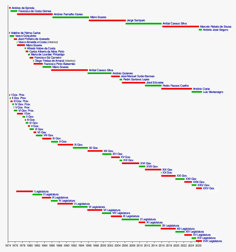 Abaixo estão representados numa linha temporal os Presidentes da República, Primeiros-ministros e Legislatura da Assembleia da República.