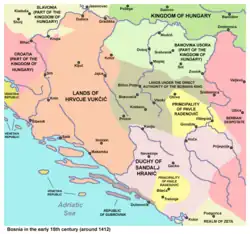 Em janeiro de 1409, a notícia da intenção do Rei Ladislau de vender seus direitos sobre a Dalmácia para Veneza chegou a Hrvoje, a quem havia sido prometida a terra como governador em nome de Ladislau. Hrvoje não tinha mais motivos para apoiar Ladislau contra Sigismundo e fez as pazes com este último, seguido pela maioria dos nobres bósnios. [16] Tordácato e Sandalj permaneceram no acampamento de Ladislau, o que levou a uma guerra civil. Ostoja aproveitou a oportunidade para tentar recuperar o trono, mas Sigismundo também pretendia ser coroado Rei da Bósnia "à maneira solene de Tordácato I". [17] A reivindicação de Sigismundo à Bósnia, derivada do seu acordo com os Rusag em 1394, foi reconhecida por Hrvoje, enquanto Sandalj cruzou para Ostoja. [16]