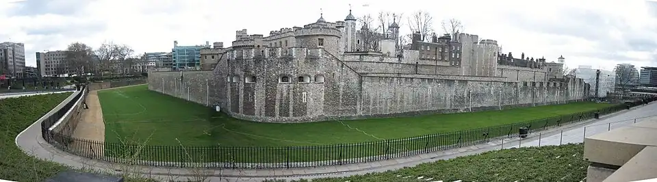 A muralha externa da Torre de Londres, com a muralha de cortina da Ala Interior visível atrás. No centro está o Monte de Legge.