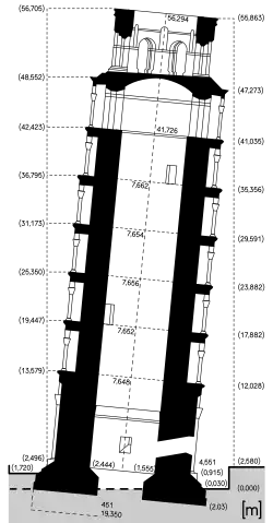 A altura do solo ao topo da torre é de 55,86 metros no lado mais baixo e de 56,70 metros na parte mais alta. A espessura das paredes na base é de 4,09 metros e 2,48 metros no topo. Seu peso é estimado em 14 500 toneladas. A torre tem 296 ou 294 degraus: o sétimo andar da face norte das escadas tem dois degraus a menos. Antes do trabalho de restauração realizado entre 1990 e 2001 a torre estava inclinada com um ângulo de 5,5 graus,[1][2][3] estando agora a torre inclinada em cerca de 3,99 graus.[4]