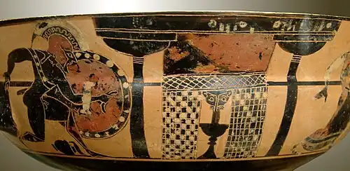 Por vezes alguns detalhes das mortes semelhantes de Troilo e Astíanax são trocados.[84] Uma destas imagens,[85] não deixa claro qual das duas mortes está sendo retratada. A idade da vítima é quase sempre um indicador de qual das histórias está sendo ilustrada, e o tamanho relativamente pequeno aqui pode indicar esta como sendo a morte de Astíanax, porém é comum que até mesmo Troilo seja mostrado como muito menor que seu algoz (caso da figura na cílice mostrado nesta página). Outros fatores, no caso, são a presença de Príamo (o que sugere Astíanax), a de Atena (que indica Troilo) e o fato da cena se passar fora dos muros de Troia (novamente indicando Troilo).[86]
