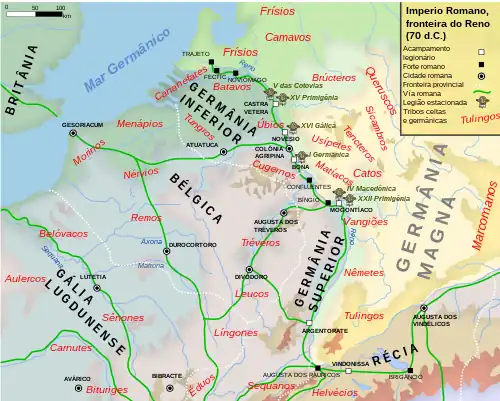 Meio século depois da revolta dos ilírios, estouraria na Germânia outro sangrento conflito em que estariam presentes como protagonistas as tropas auxiliares romanas. Os batavos eram uma tribo germânica pertencente ao grupo dos catos que habitava no território situado entre o os rios Reno e Waal, o qual posteriormente passaria a fazer parte da província da Germânia Inferior (atuais Países Baixos). A dificuldade de cultivarem as suas terras, devido à presença de pântanos, fazia que fossem uma tribo pequena: não chegavam aos 35 000 homens.[27]