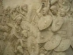 - ↑ As legiões II Itálica e III Itálica durante o reinado de Marco Aurélio (161 - 180) e a I Pártica, II Pártica e III Pártica durante o reinado de Septímio Severo (197 - 211)