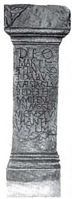 Deo / Marti / Thincso / et duabus / Alaisiagis / Bed (a) e et Fi / mmilen (a) e / et n (umini) Ago (usti) Ger / m (ani) cives Tu / ihanti / v (otum) s (olverunt) l (ibentes) m (erito)