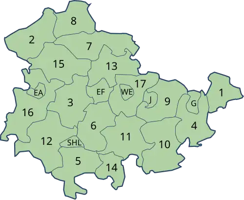 A Turíngia está dividida em 17 distritos (Kreise, singular Kreis; ou ainda distritos rurais: Landkreise, singular Landkreis) e 6 cidades independentes (Kreisfreie Städte; ou ainda distritos urbanos: Stadtkreise, singular Stadtkreis).