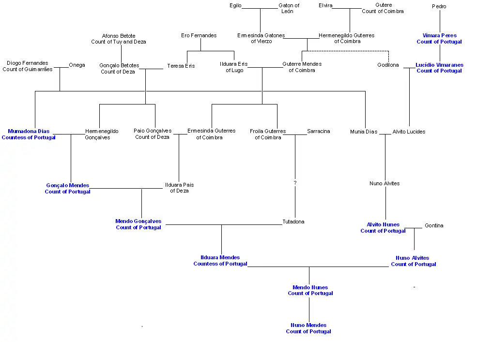 - Lucídio Vimaranes[2] (Guimarães [que na época se denominava "Guimaranis"], ca. 850 – Guimarães 922), conde desde 873, casou com Gudilona Mendes, filha de Hermenegildo Guterres, conde de Portugal, e de Ermesinda Gatones;