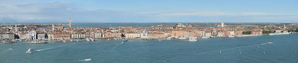 Veneza ocupa uma localização excepcional numa lagoa do Mar Adriático, a lagoa de Veneza. O principal núcleo da cidade, o seu centro histórico, é constituído por um conjunto de ilhas no centro da lagoa, com um total de 60 053[13] habitantes. A estas ilhas no centro da lagoa há que juntar outras no estuário (30 295[13] residentes) e também na parte continental (180 661[13] residentes), que com os seus 130,03 km², representam cerca 83% da área emersa do território.