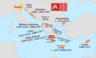 A influência política de Veneza foi marcante na história da Europa,[12] sobretudo quando a partir da Alta Idade Média se expandiu graças ao controlo do comércio com o Oriente e aos benefícios que daí vinham. Essa expansão deu-se sobretudo na zona do mar Adriático e do Mar Egeu. Veneza alcançou o apogeu na primeira metade do século XV, quando os venezianos começaram a expandir-se pela Itália oriental, como resposta ao ameaçador avanço de João Galeácio Visconti, duque de Milão.[carece de fontes?]