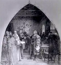 Em 21 de março de 1498,[5] um pequeno grupo de Schieringers de Westergo encontrou-se secretamente com o general-stadthouder dos Países Baixos Alberto, duque de Saxe, em Medemblik, pedindo sua ajuda.[6] Alberto, que havia obtido reputação como um comandante militar formidável, aceitou a proposta e logo conquistou toda a Frísia. O imperador Maximiliano I de Habsburgo designou Alberto como Podestà hereditário e governador da Frísia em 1499.[7]
