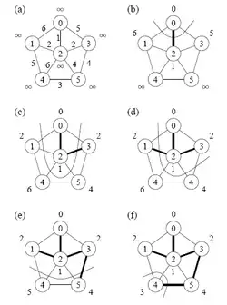 Figura 1: passo a passo da execução do algoritmo de Prim iniciado pelo vértice 0