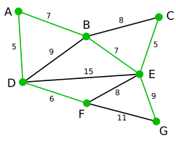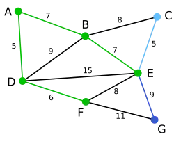 {C,E,G} Agora podemos escolher entre os vértices C, E, e G. C está a uma distância de 8 de B, E está a uma distância 7 de B e G está a 11 de F. E é o mais próximo do subgrafo e, portanto escolhemos a aresta BE.