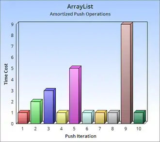 Em geral. se considerássemos um número arbitrário de inserções n em um arranjo de tamanho n, nós notaríamos que todas as operações de inserção tomariam tempo constante menos a última, que tomaria tempo O(n) para realizar a operação de dobrar o tamanho. Como existiriam n operações nós podemos pegar a média disso e concluir que a inserção de elementos em um arranjo dinâmico leva :, tempo constante.[3]