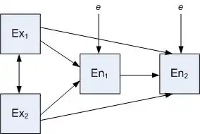 No modelo abaixo, as duas variáveis exógenas (Ex1 e Ex2) são modeladas como sendo correlacionadas conforme representado pela seta de duas pontas. Ambas as variáveis têm efeitos diretos e indiretos (através de En 1) sobre En2 (as duas variáveis/fatores dependentes ou 'endógenos'). Na maioria dos modelos do mundo real, as variáveis endógenas também podem ser afetadas por variáveis e fatores externos ao modelo (efeitos externos, incluindo erro de medição). Esses efeitos são representados pelo "e" ou termos de erro no modelo.