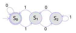A figura à direita representa um autômato finito determinístico através de um Diagrama de transição de estados. Nesse autômato há três estados: S0, S1 e S2 (representados graficamente por círculos). A entrada é constituída por uma sequência finita de caracteres 1s e 0s. Para cada estado da máquina, existe um arco de transição levando a um outro estado para ambos caracteres 0 e 1. Isso significa que, em um dado estado, após a leitura de cada símbolo a máquina determinística transita para um único estado referente à aresta associada ao símbolo. Por exemplo, esteja o autômato atualmente no estado S0 e o símbolo de entrada para aquela instância um '1', então ele salta deterministicamente para o estado S1. Todo AFD possui um estado inicial (denotado graficamente por uma seta de origem anônima) onde a sua computação começa e um conjunto de estados de aceitação (denotados graficamente por um círculo de borda dupla) o qual indica a aceitação da cadeia de entrada.